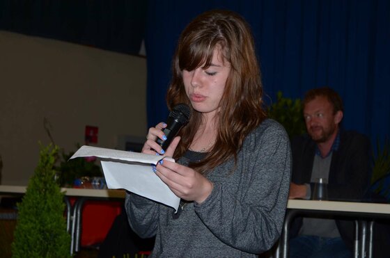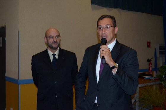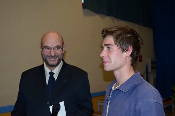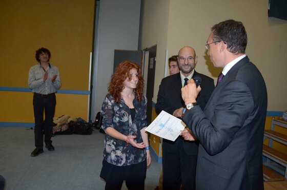 [1] Avant que ne débute la cérémonie pour le prix jeune mousquetaire, la cérémonie M. Luc Simon-Collonge (Président de la section gersoise de l’Association Nationale des Membres de l’Ordre National du Mérite et Secrétaire National de l’ANMONM), le sous-préfet de l’arrondissement de Condom, M. Grégory Kromwell, ont remis un prix de la citoyenneté au membre du bureau de la junior association « Un livre dans la poche », Nathanaël Trnka, Lisa Sarran, Camille Rago et également à Maïté Smerz pour son implication sur le lycée de Mirande. « Nous remettons cette récompense, pour développer et encourager chez les jeunes : la citoyenneté, l’esprit civique, le devoir de mémoire, de conservation de l’histoire... C’est important, ces jeunes qui font des choses au quotidien, un ensemble de petits gestes dans la cité », a présenté M. Simon-Collonge. Au coté de ces deux personnalités se sont relayés M. Peyret, Mme Dupuy-Mitterrand (conseillère régionale) et M. Pujol (vice président du conseil général) pour attribuer ces « diplômes ». Enfin, un chèque pour l’association a été remis à M. Eric Busson, professeur au lycée d’Artagnan et tuteur de cette structure.