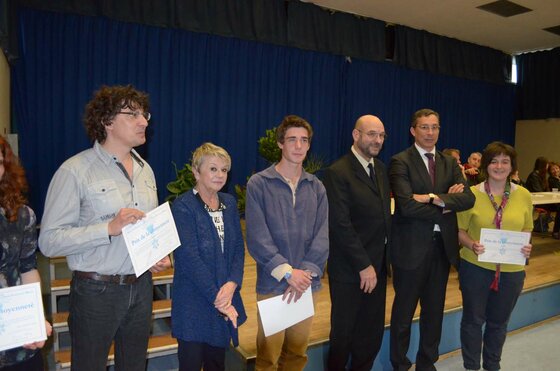 Christian Peyret, maire de Nogaro a remis un chèque de 1000 euros au lauréat. Avec Mme Dupuy-Mitterrand, ils ont félicité M. Éric Busson pour tout le travail accompli depuis le lancement de ce prix.